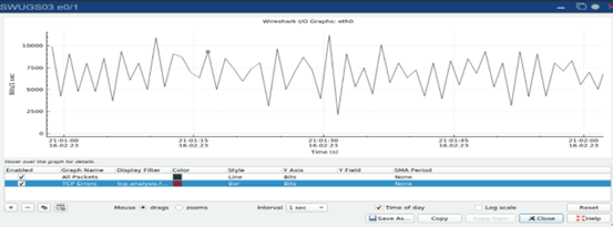 O SWUGS_01 apresentando-se como root bridge para oito redes privadas virtuais e o SWUGS_02 como root bridge para cinco redes privadas virtuais onde cada uma delas atinge aproximadamente 1 Mbps equivalendo a dez por cento da sua capacidade máxima, abaixo o perfil de tráfego da rede comutada Ethernet.