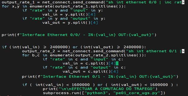 Tendo em conta que a configuração das SVIs (Switch Virtual Interface) fora realizada no router core (RT_PE01-CORE-UGS_BOX1), para permitir o roteamento do tráfego das Vlans, o script acede o router core para obter a validação do tráfego real nas interfaces, uma vez que o processo de comutação é feito para Vlans que apresentam maior tráfego e que concorrem para o desbalanceamento do mesmo na rede.