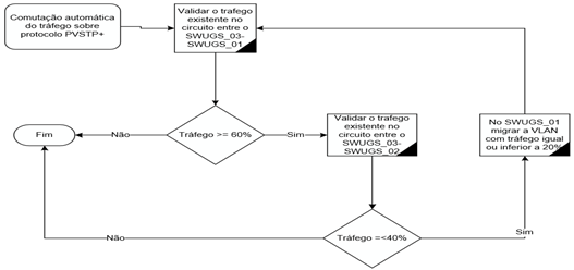 The proposal presented, which consisted of implementing a script with Python programming language, was able to satisfy the traffic engineering in the Ethernet switched network, since after its application it was possible to verify the automatic switching of traffic in the scenario where the circuit between SWUGS03 and SWUGS01 reached a traffic in Mbps equal to or greater than sixty percent of its installed capacity. In this way, the percentage values distributed in the connections to the primary and secondary root bridge reflected the traffic balancing proposed when the work began.