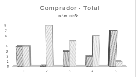 O gráfico apresenta o número total de perguntas colocadas aos compradores, sendo a primeira cinquenta por cento de "sim", cem por cento "não" para a segunda e as outras variam entre vinte a sessenta por cento de "sim".