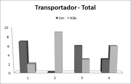 O gráfico apresenta a distribuição total de perguntas colocadas aos transportadores, sendo a primeira com mais sessenta e cinco por cento de "sim", cem por cento "não" para a segunda e as outras duas o "sim" varia entre mais vinte e cinco a sessenta e dois por cento.